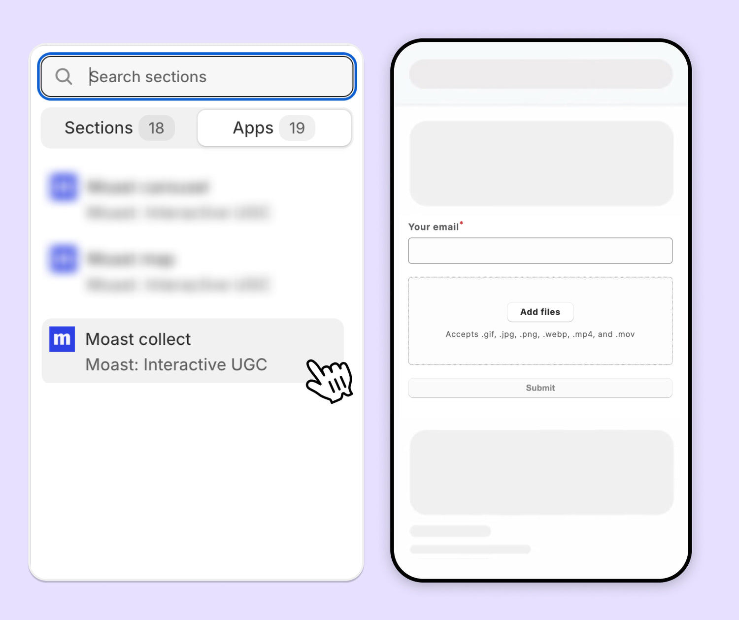 Using the Shopify editor, simply drag and drop the Moast Collect app block wherever you want it to appear on your store. You can create a dedicated collection page, add it to your product pages, homepage, or any other page where you'd like customers to upload content.
