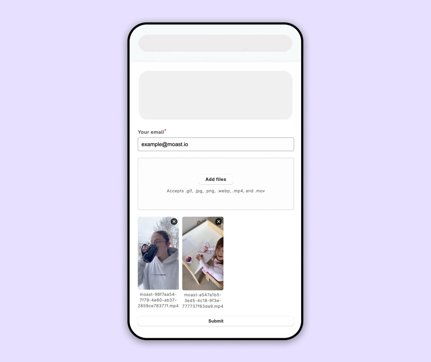 With Moast Collect, customers can upload photos and videos right on your site. Try it yourself, upload a photo or video to see how it works.